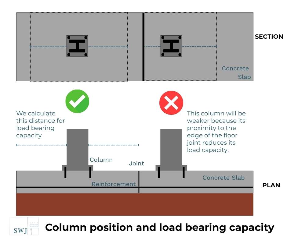 SWJ Consulting identified this issue during a site visit. Fortunately, the building was new and as such there were accurate as-built drawing records showing where the slab joists were and how that had been constructed. Once this information had been gathered, it was a simple exercise to overlay those as-built joint positions onto the base plate plan for the mezzanine to establish where there was a problem