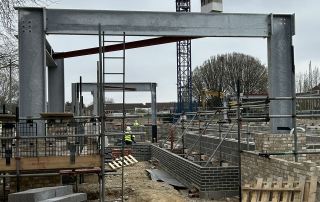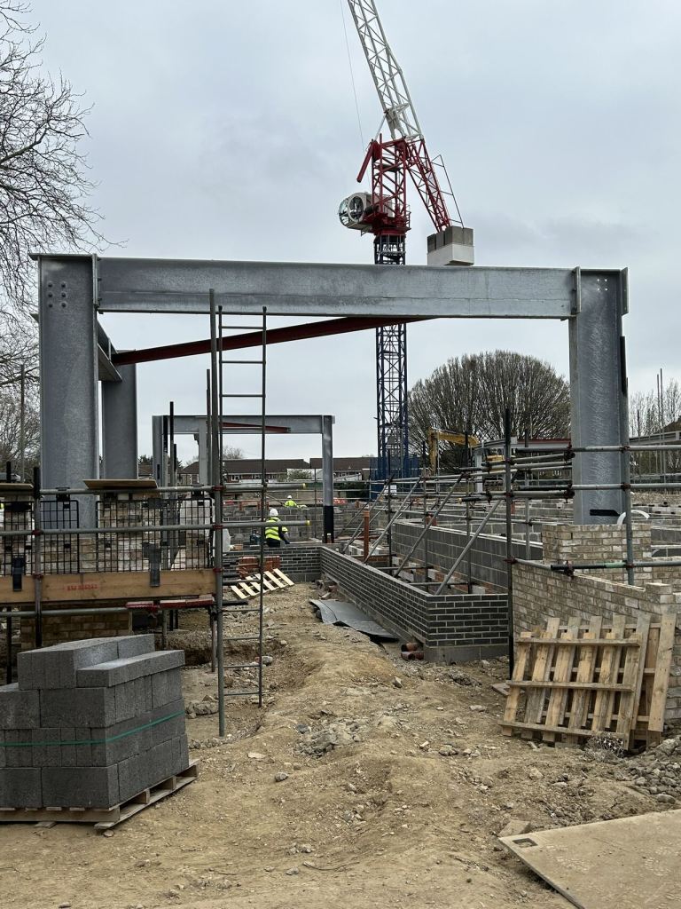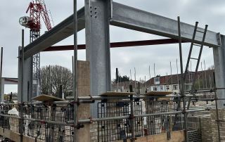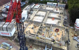 We identified that there was a central link area between the two larger four-story ‘wings’ and adjusted the design to build the two four-story buildings with the crane situated between them. In this way, the crane could then pull out to build the single-story glazed link connecting the building.